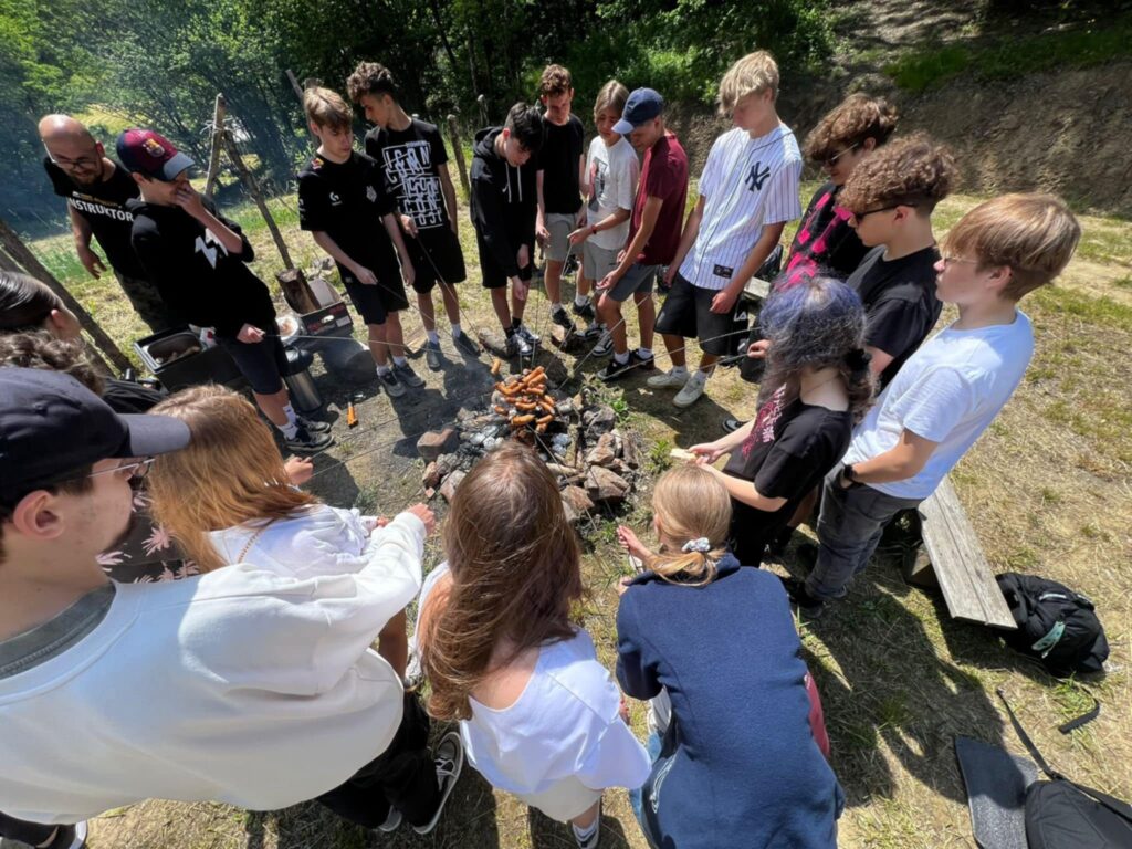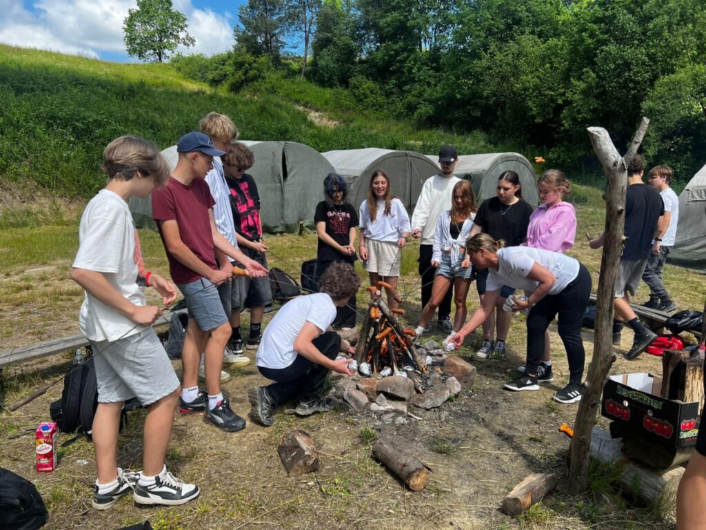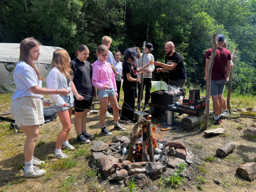 Po intensywnej zabawie przyszedł czas na odpoczynek przy ognisku. Pieczenie kiełbasek i ziemniaków w cieniu drzew nie tylko nasyciło głód, ale też dało chwilę wytchnienia i okazję do wspólnych rozmów – tych poważnych i zupełnie błahych, ale ważnych, bo budujących relacje.